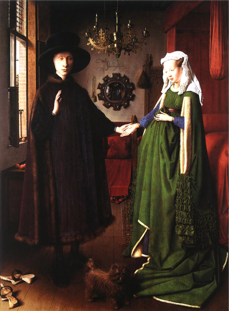 Jan Van Eyck, Giovanni Arnolfini and His Bride (1434) Iconography – shoes, mirror,