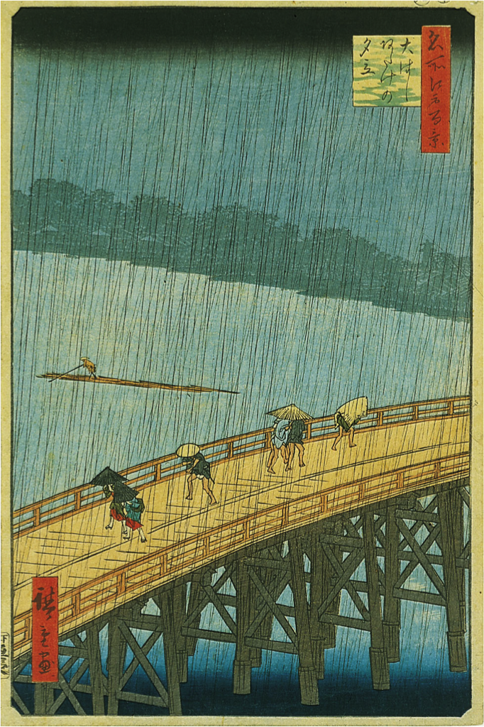Hiroshige, Rain Shower at Ohashi Bridge (1857) Japanese Color Woodblock. On rice paper.