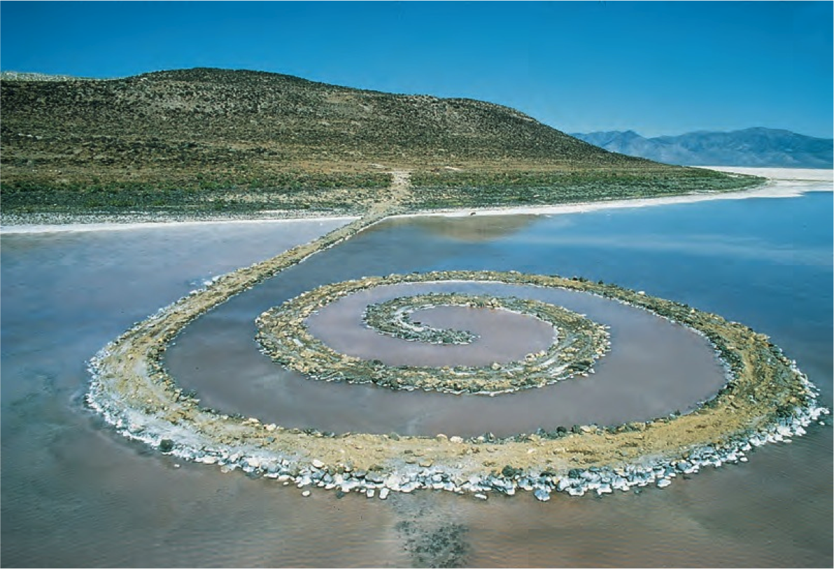 Robert Smithson, Spiral Jetty, Great Salt lake, Utah (1970) Earthwork. Also a film on it. Sometimes submerged.