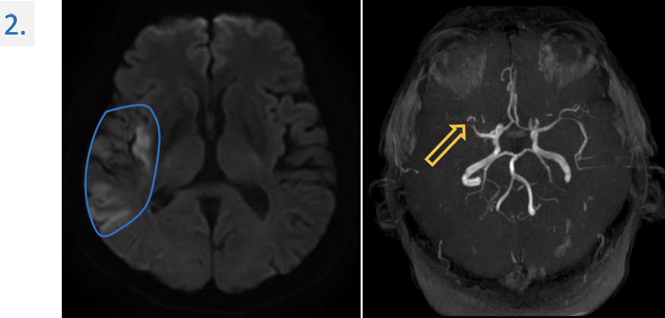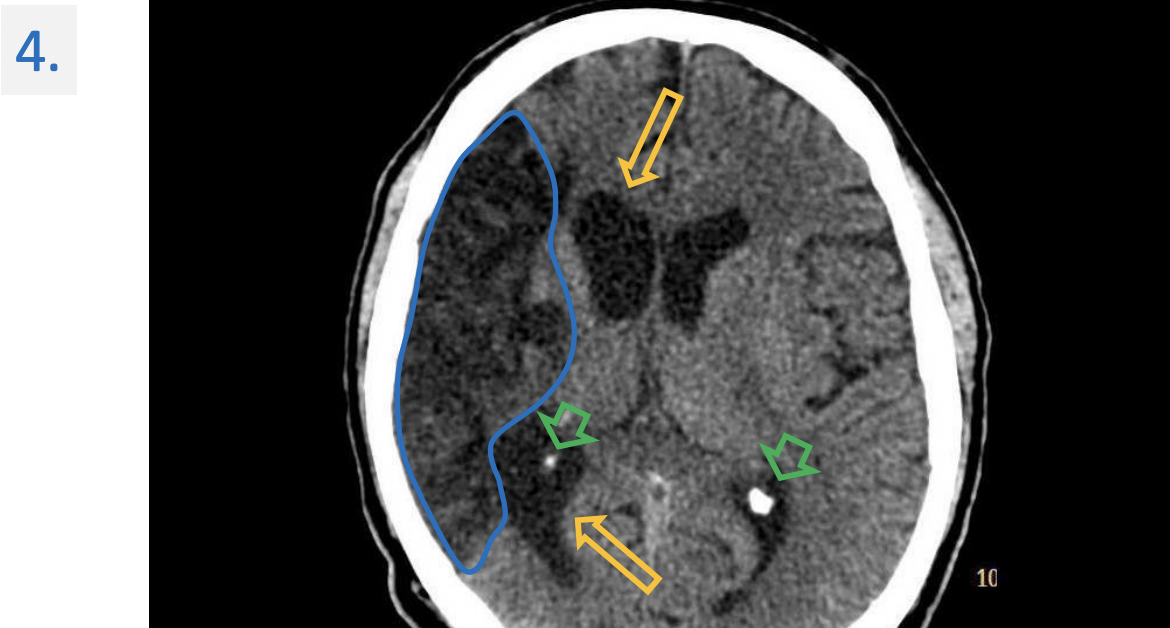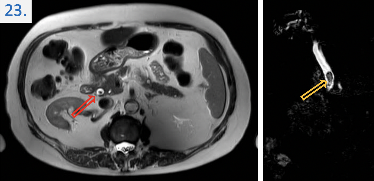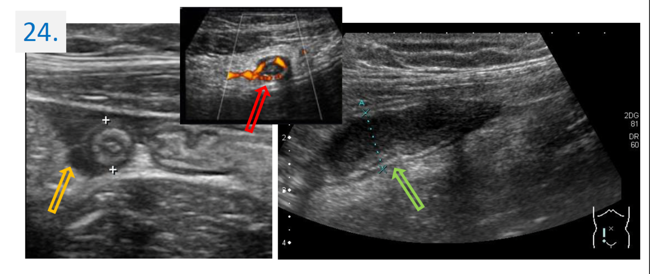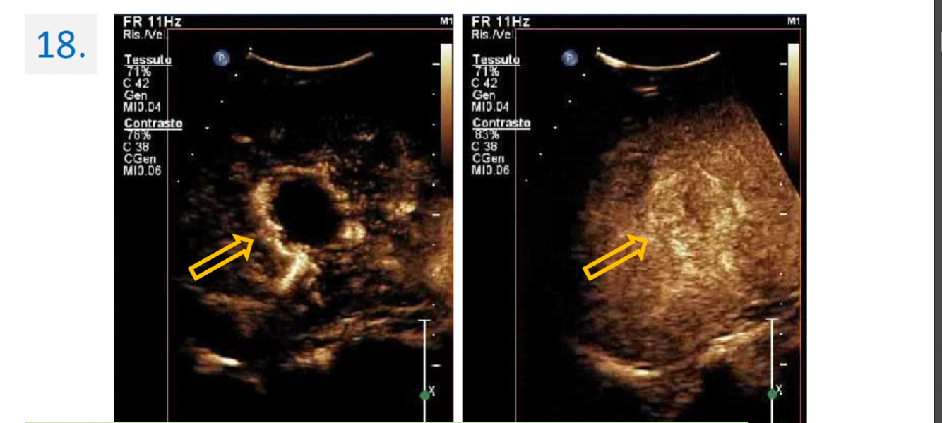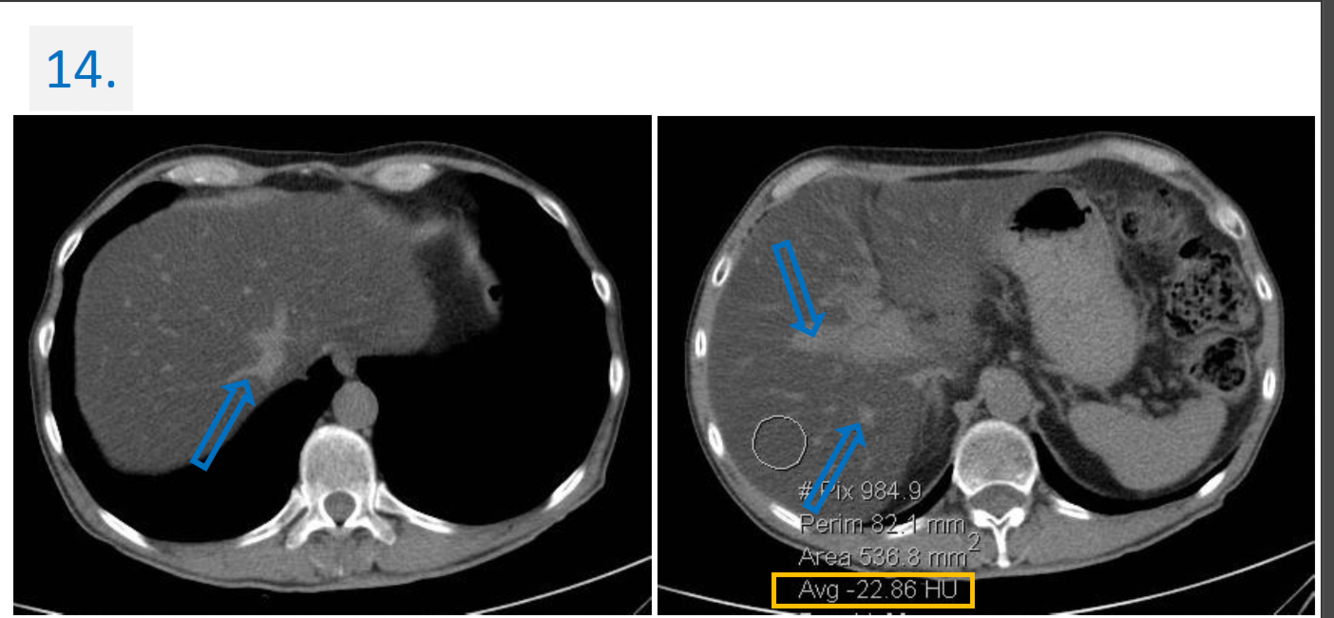 -The vessels (blue arrows) → denser -relative to the liver parenchyma-