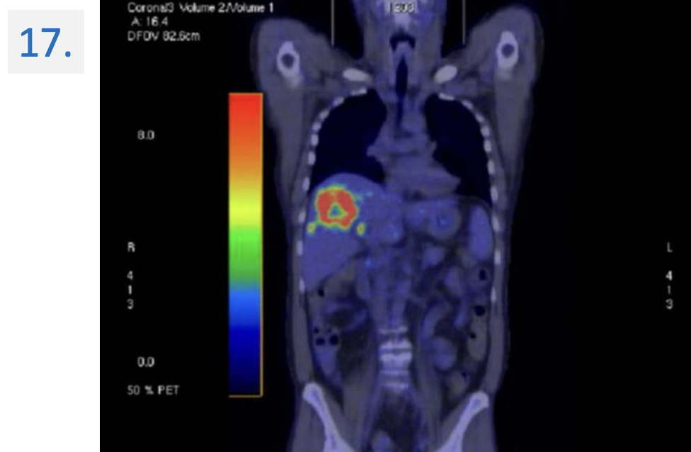 FDG PET-CT (right panel: non-contrast CT) → 18(F)-fluoro-deoxy-glucose