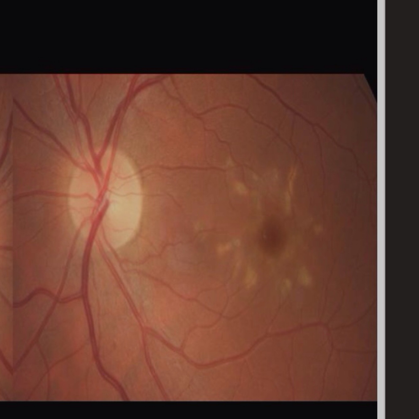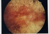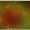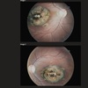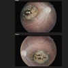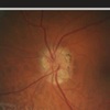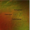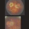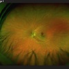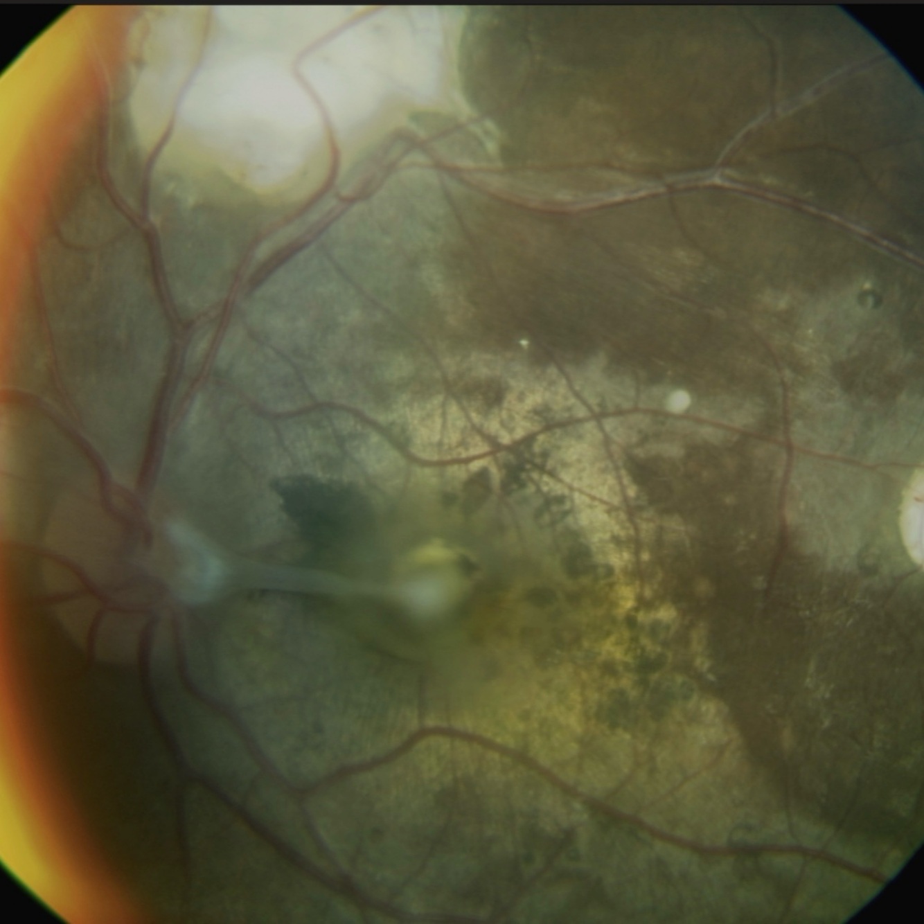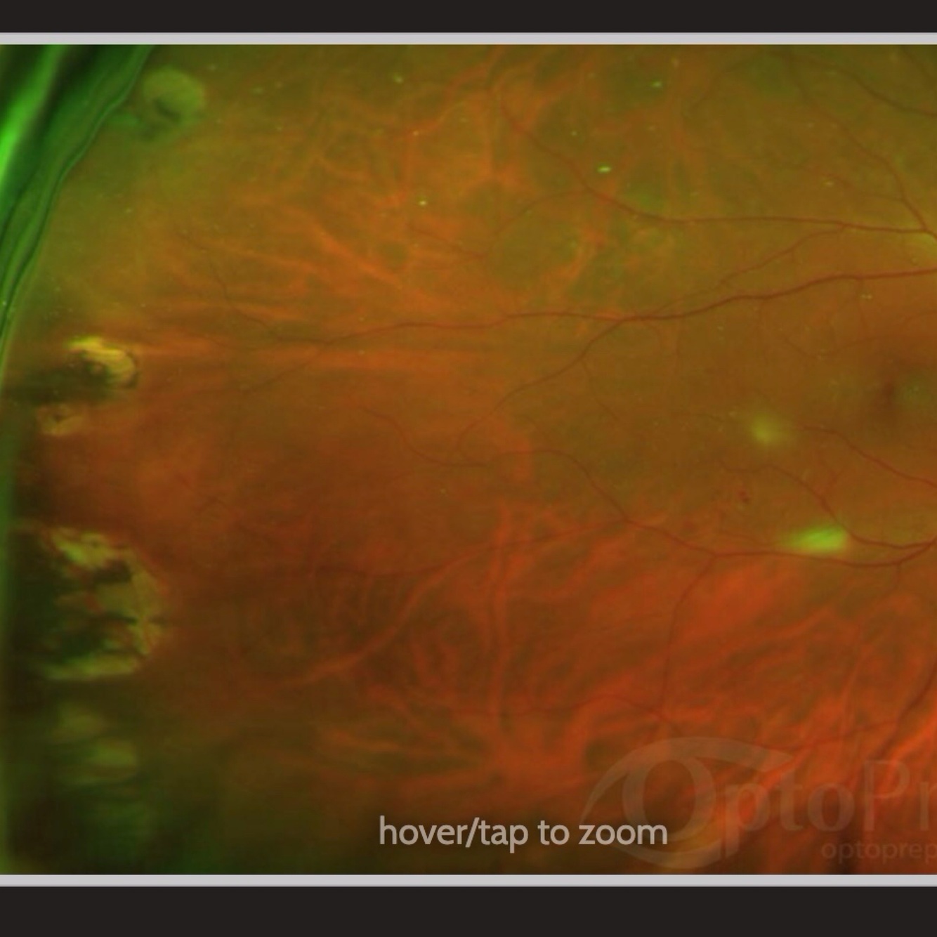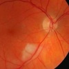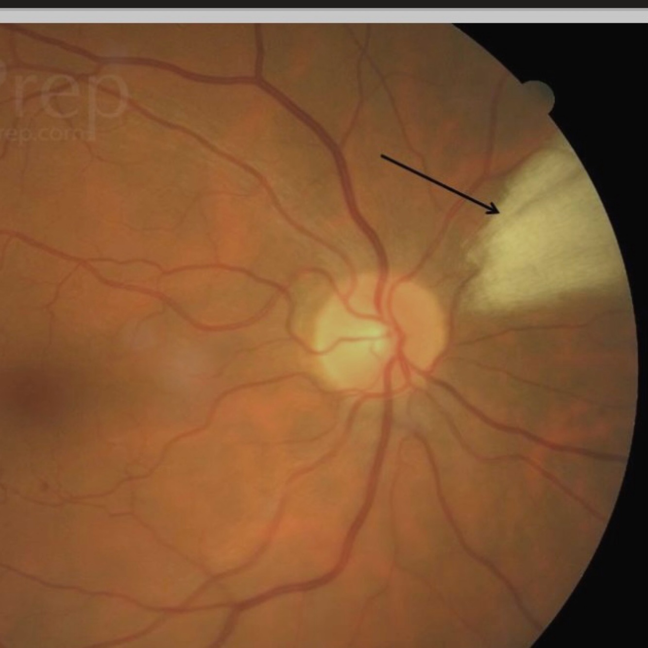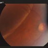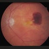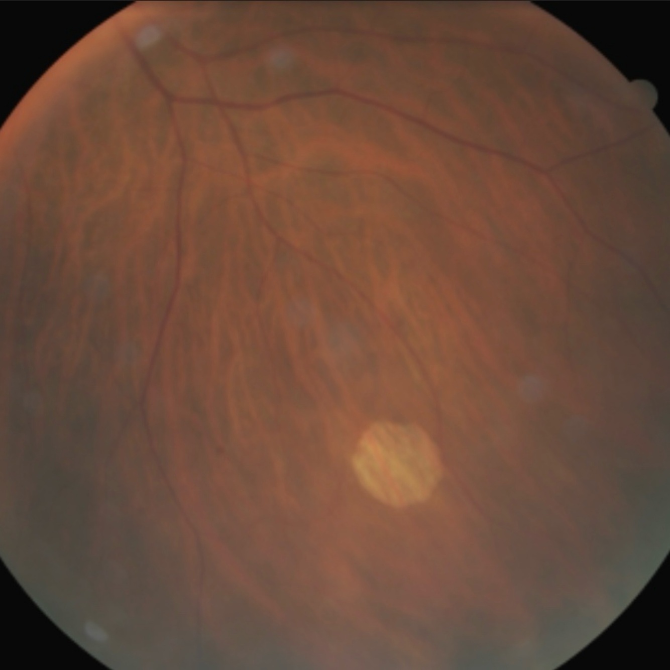 ** window defect, appears as yellow-white. Well demarcated circular lesion present in mid-peripheral retina