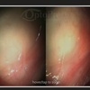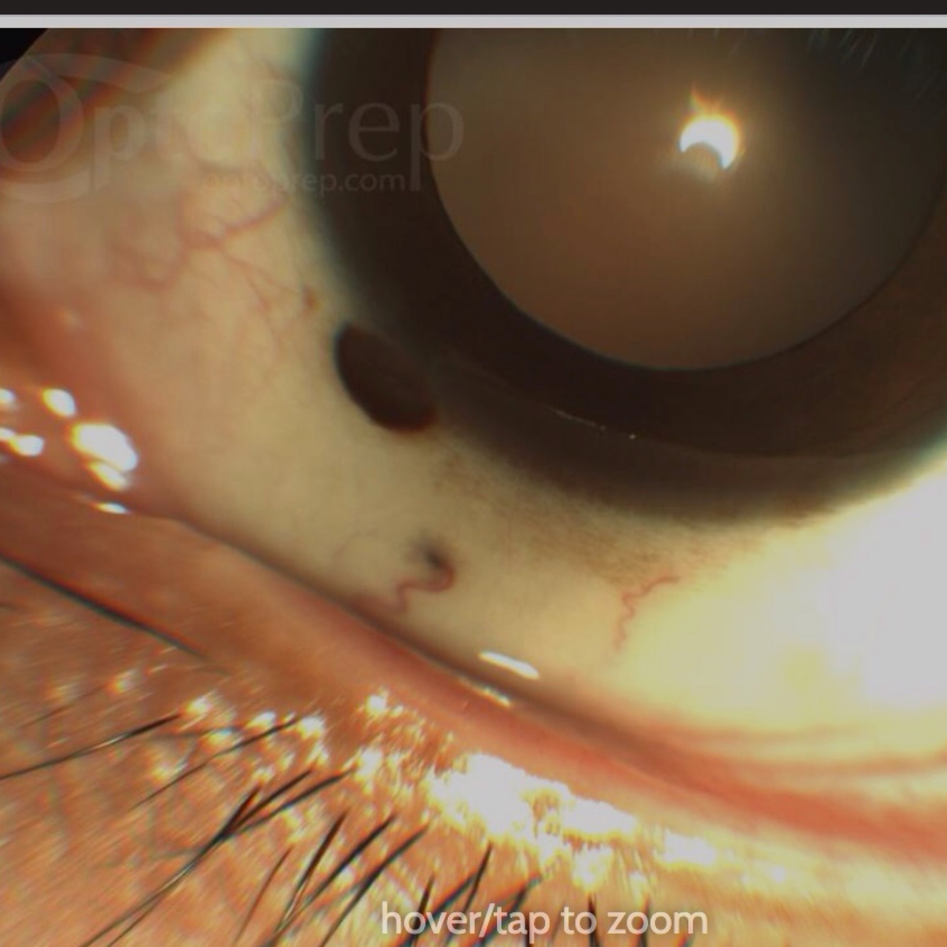 * mass not freely movable over sclera and tends to be homogenous in color and lack cystic spaces