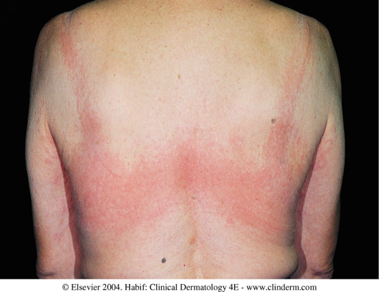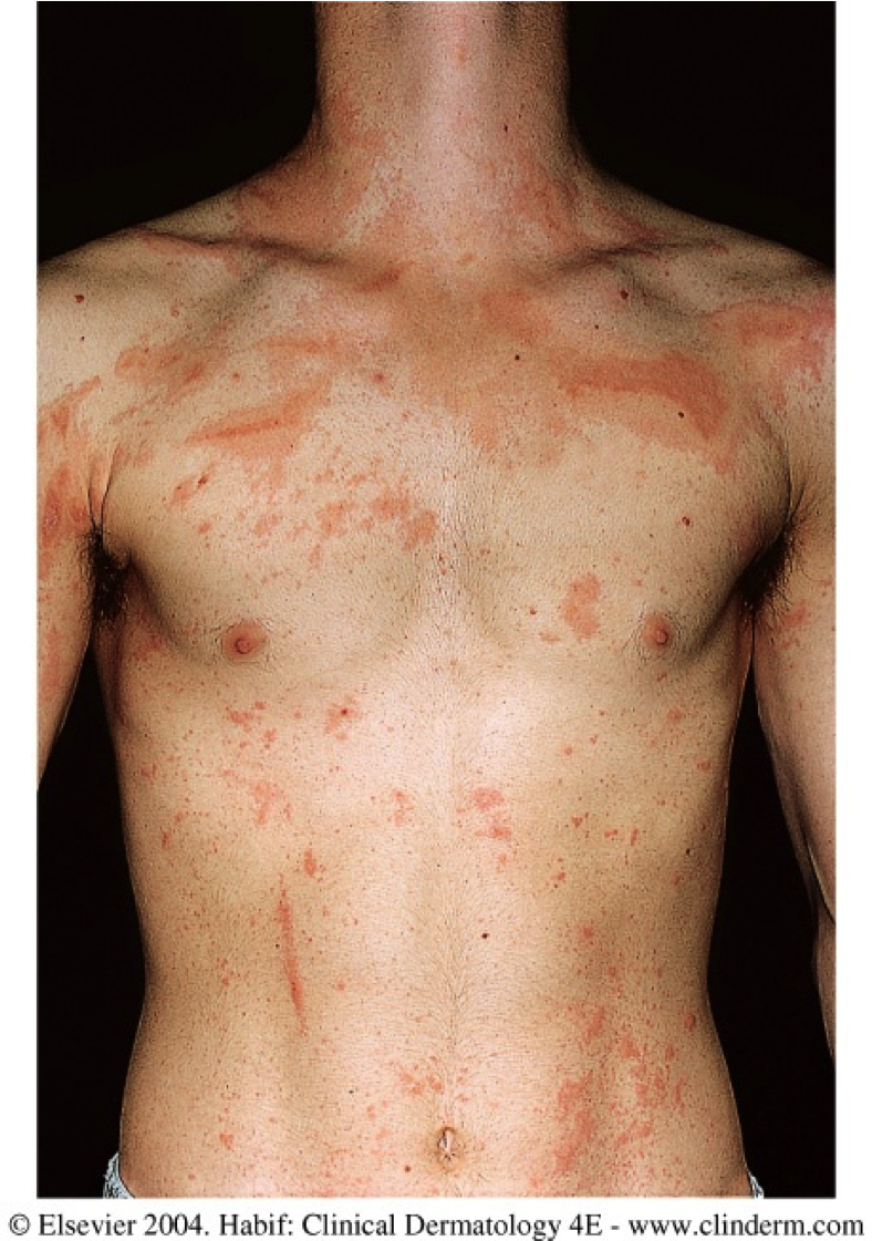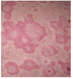 Pink non-scaly well-defined firm blanchable polycyclic Wheals scattered on the trunk