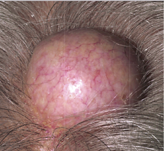 White-grey solitary smooth soft dome shaped Nodule on the scalp.