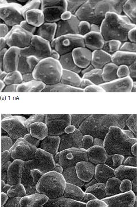 The lower SEM image appears much sharper than the one above, but is less smooth in appearance. What parameter was likely changed and how would that result in a less smooth appearance?