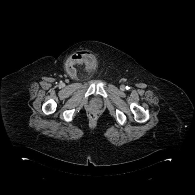 hernie inguinale étranglée. On voit une petite bulle d’air= nécrose pariétale