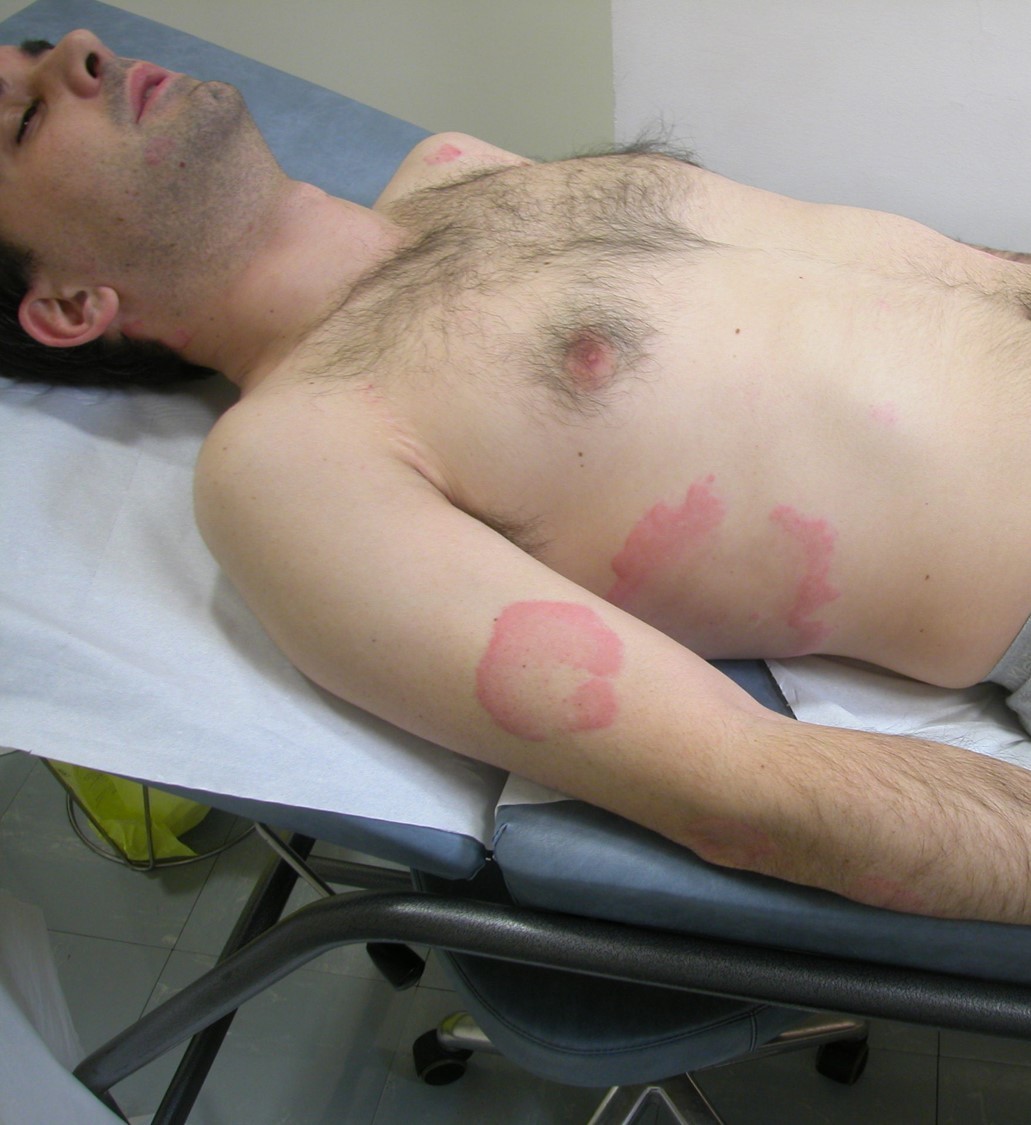 Urticaire aiguë car: dermatose figurée avec papule oedémateuse et éléments annulaires arciformes. ttt=arrêt du médicament et introduction d’antihistaminiques