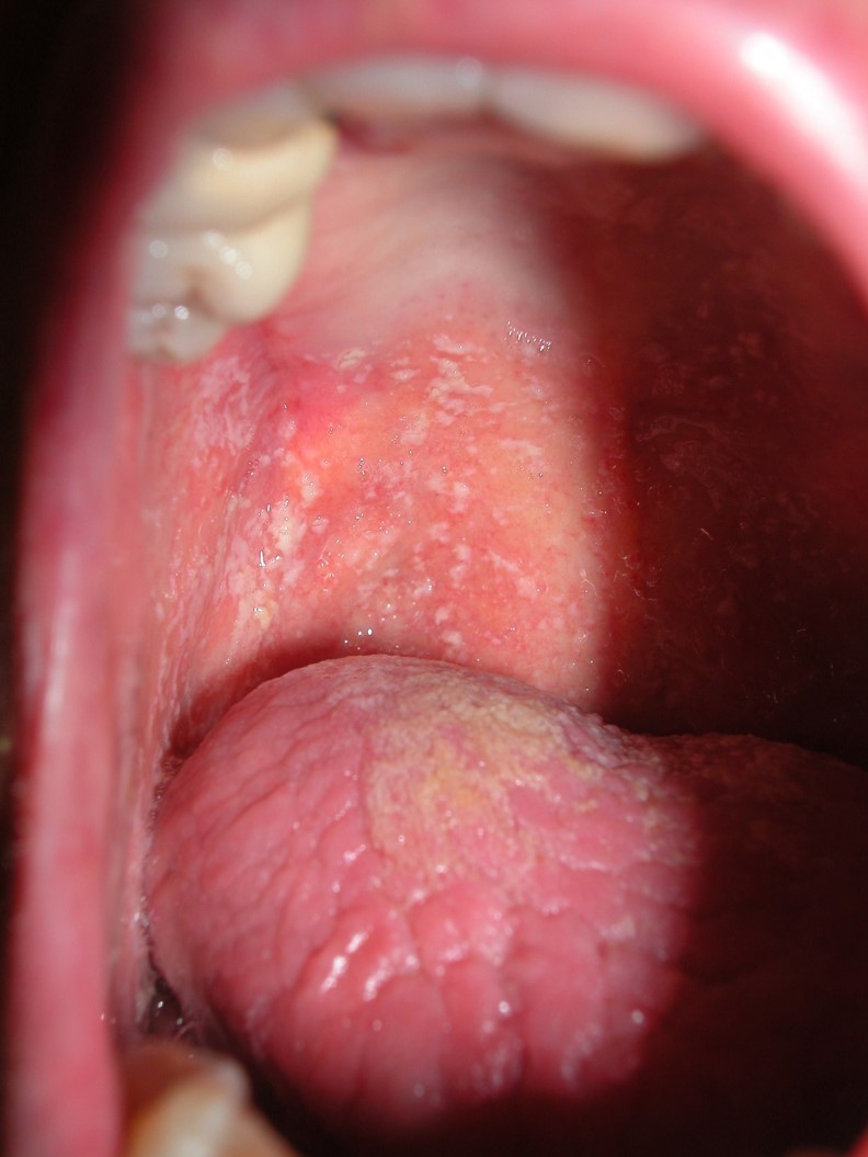 glossite et candidose oropharyngée car langue cérébriforme inflammatoire avec dépôt blanchâtre