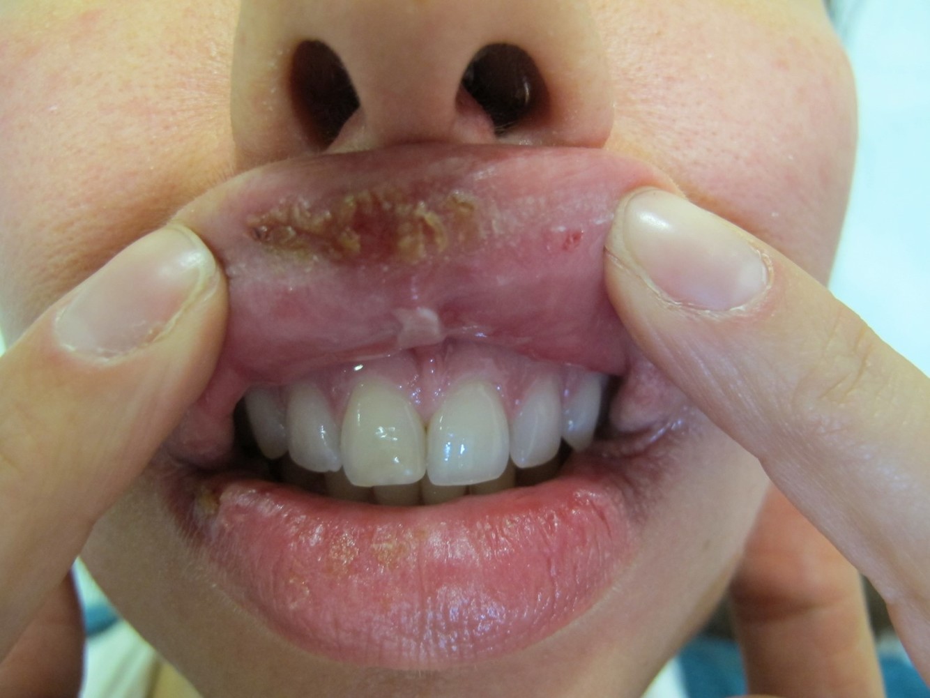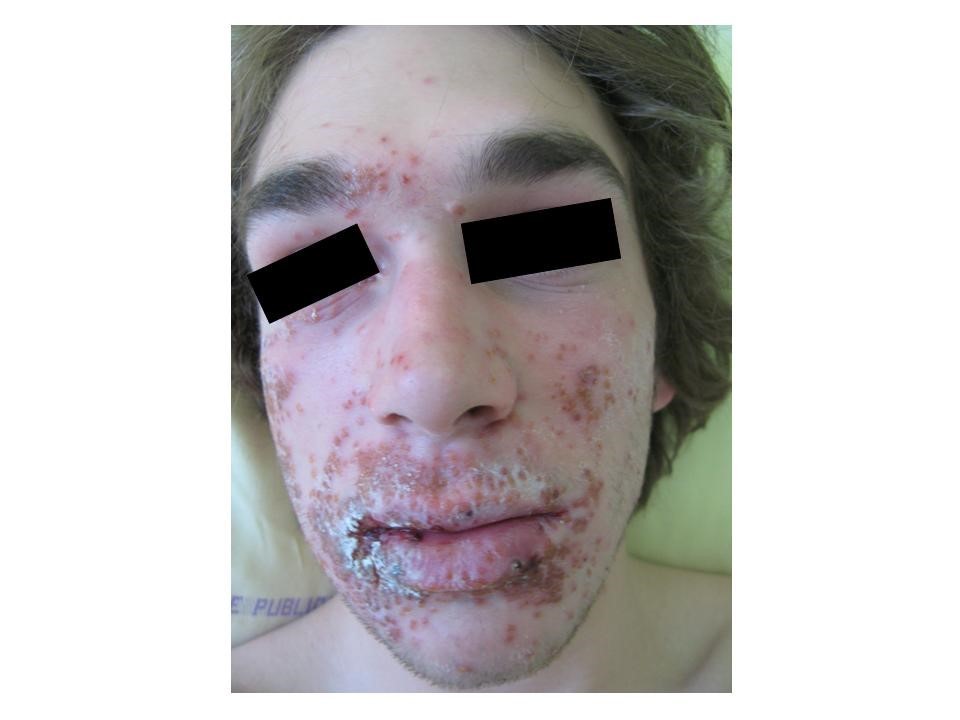 syndrome de Kaposi Juliusberg: primo infection herpétique sur dermatite atopique (on voit signe de Denie Morgan -double cerne- qui signe la dermatite atopique)
