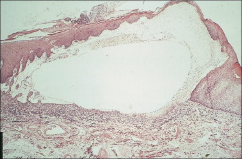 Bulle sous-épidermique, pas d’acantholyse, pas de nécrose kératinocytaire = c’est une pemphigoide bulleuse