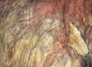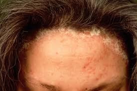 Dermatite séborrhéique lisière cuir chevelu: squames grasses.