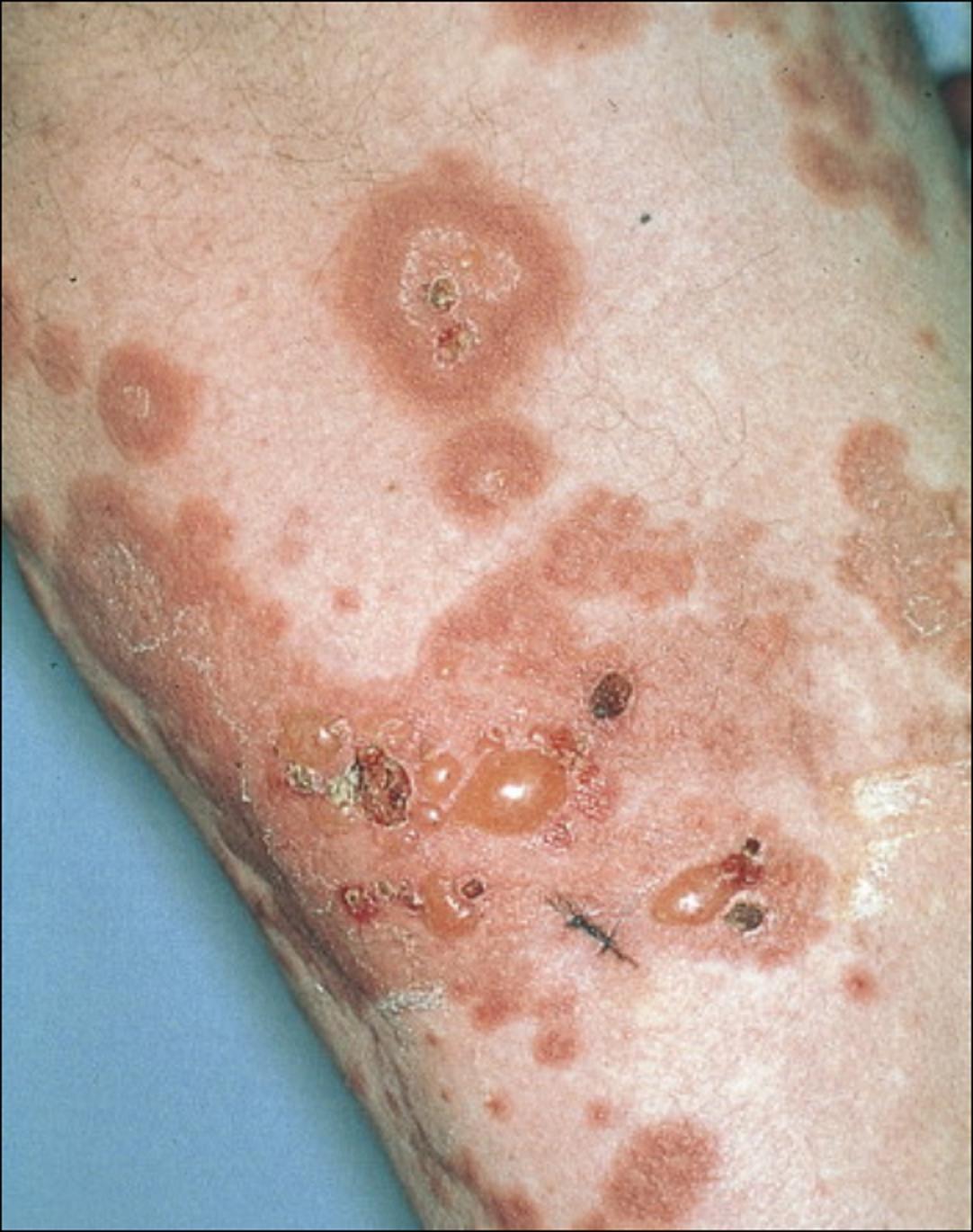 toxidermie bulleuse, érythème polymorphe bulleux, pemphygoïde cicatricielle ou pemphigus