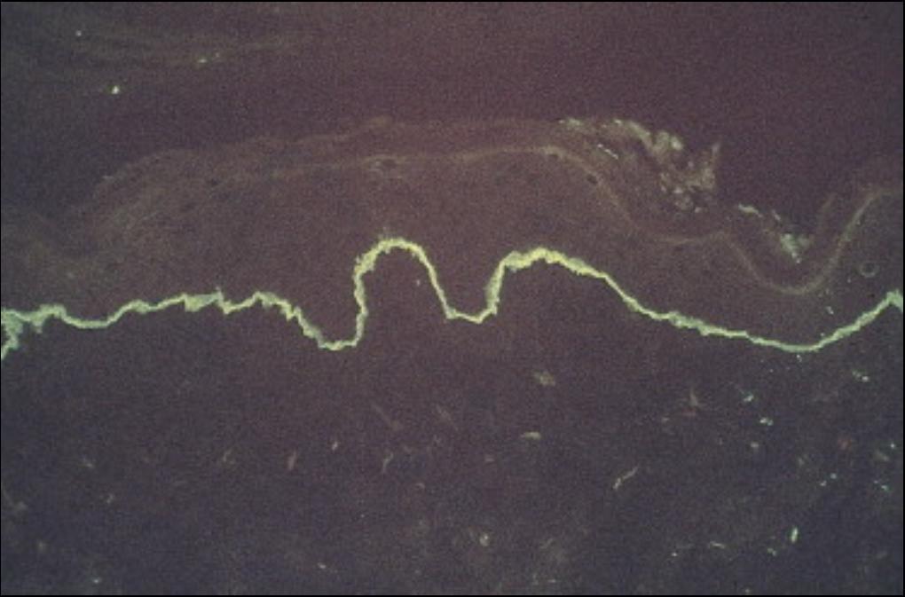 Dépôt d’IgG linéaire le long de la membrane basale = pemphigoïde bulleuse