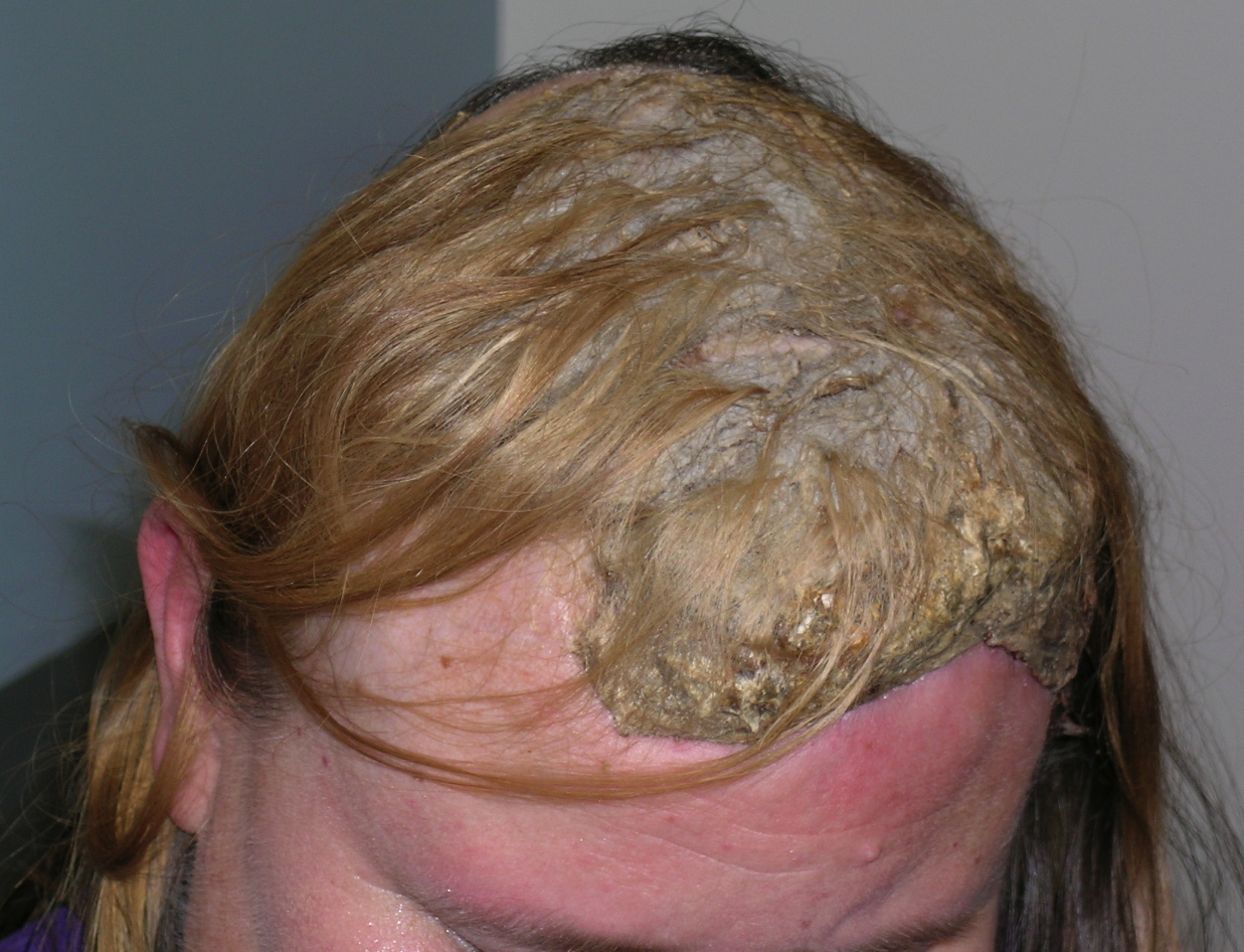 Pityriasis amiantacé, forme grave de dermatite séborrhéique (aspect de casque engainant touffes de cheveux)