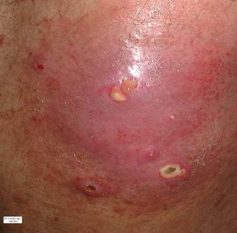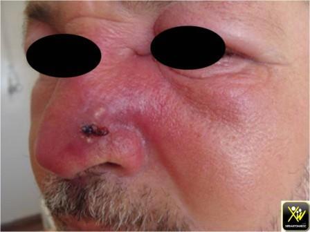 Staphylococcie maligne de la face. Partie d’un furoncle centro-facial manipulé de façon intempestive. traitement = augmentin IB 7 jours