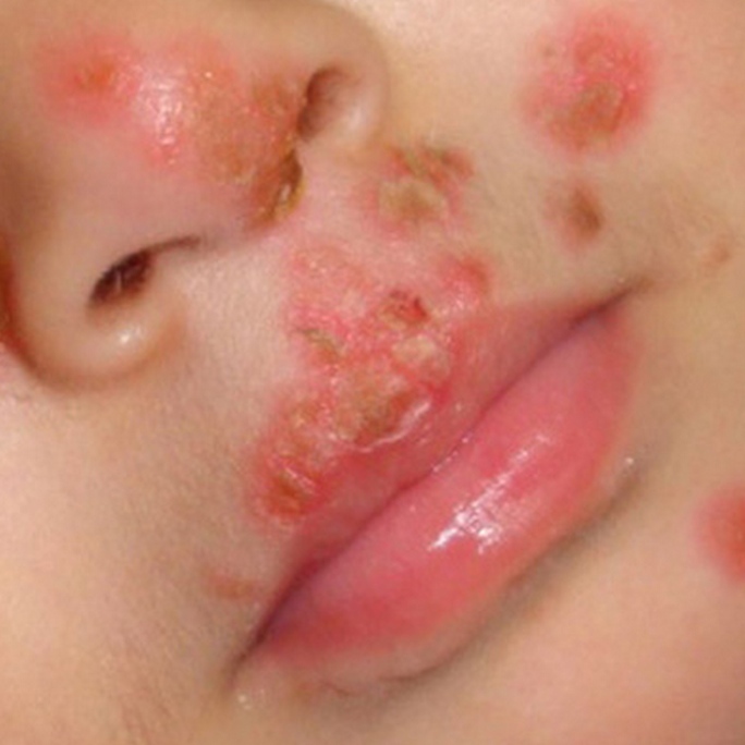 Impétigo. Antiseptique local + atb local: acide fucidique ou mupirocine