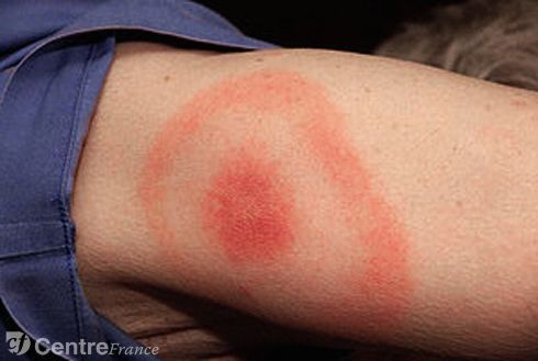 érythème chronique migrant car érythème bordure annulaire érythémateuse centrifuge active centre clair A débuté par une macule papule centrée sur la piqure.