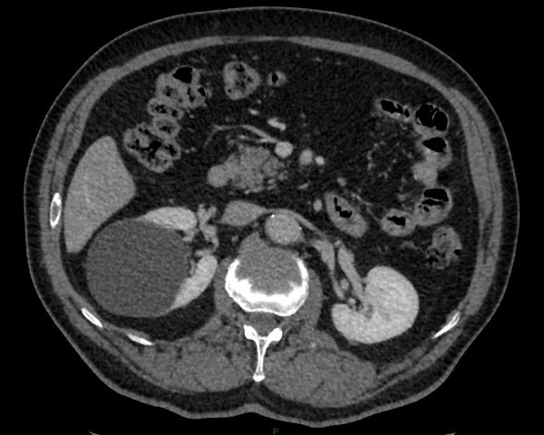 Kyste du rein droit. Pas d’éléments atypiques (pas de cloison, de calcifications, de paroi épaissie, de réhaussement par le PDC, de végétations intra-kystiques)