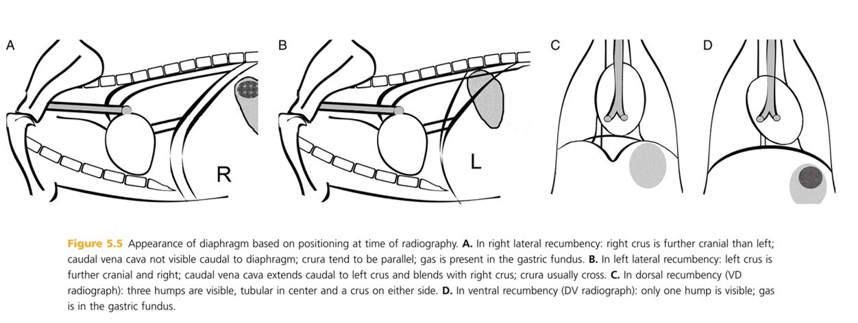 The pulmonary artery and veins should be equal in size. The artery to the cranial lung lobe is located dorsal and cranial to the vein in the lateral view. In the DV or VD views the pulmonary arteries are at the 4 and 8 o’clock positions and are lateral to the adjacent pulmonary veins. The bronchi lie between the artery and veins