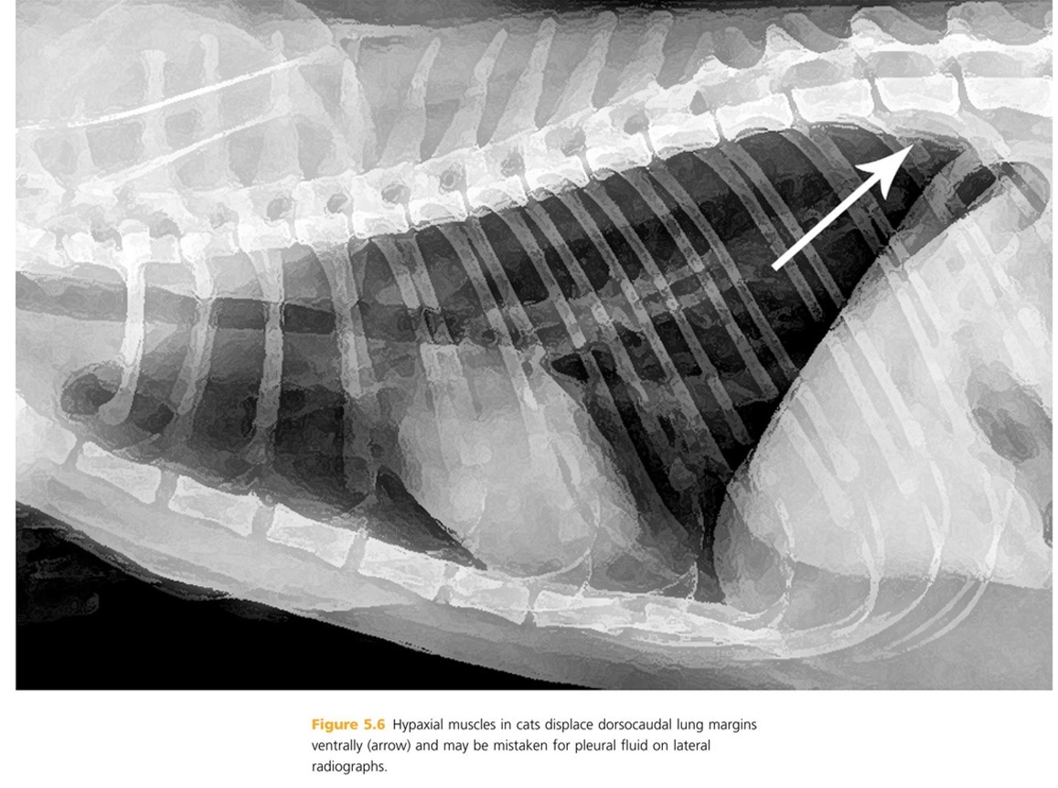 Hypaxial muscles in cats displace dorsocaudal lung margins ______ and may be mistaken for ____ ____ on radiographs.