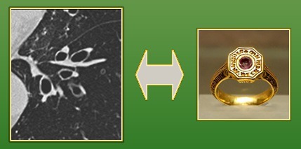 Signet-ring sing: typical in bronchiectasis when the dilated bronchus is larger than the accompanying pulmonary artery in HRCT
