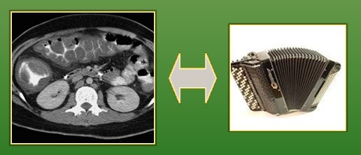 Acccordian sign: oral contrast trapped between oedemetous haustral folds and pseudomembranes formed on the surface of the colon due to pseudomembranous colitis