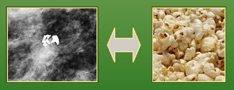Popcorn calcification: amorfus calcications with arch and rings, most commonly present in several situations in breast (degenerative fibroadenoma), chondroid lesions (enchondroma or chondrosarcoma), fibrous dysplasia, pulmonary amartoma