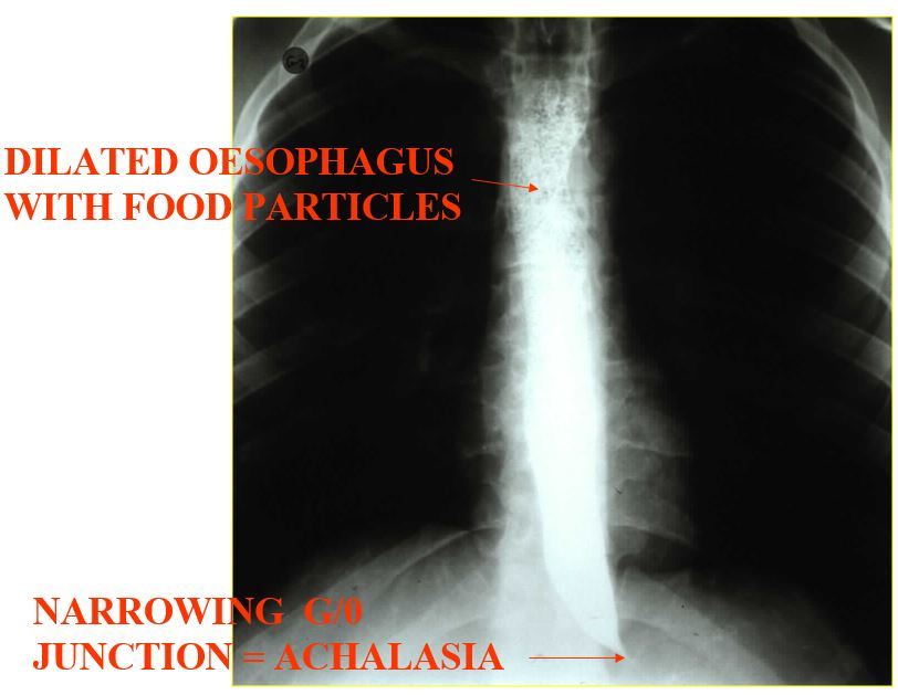 (Significant negative) I note that there are no apple-core strictures seen to suggest the presence of oesophageal SCC. (~3% of pts w achalasia)