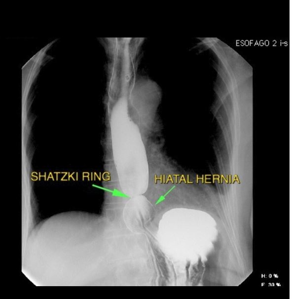 Demonstrating... a dilated pouch (the hernia) below a smooth, short, symmetric, ring-like constriction (the GOJ) - Schatzki ring. May be assoc. c¯ smooth area of concentric narrowing in the distal oesophagus: reflux-stricture. I note (Significant negative) that there are no apple-core strictures seen