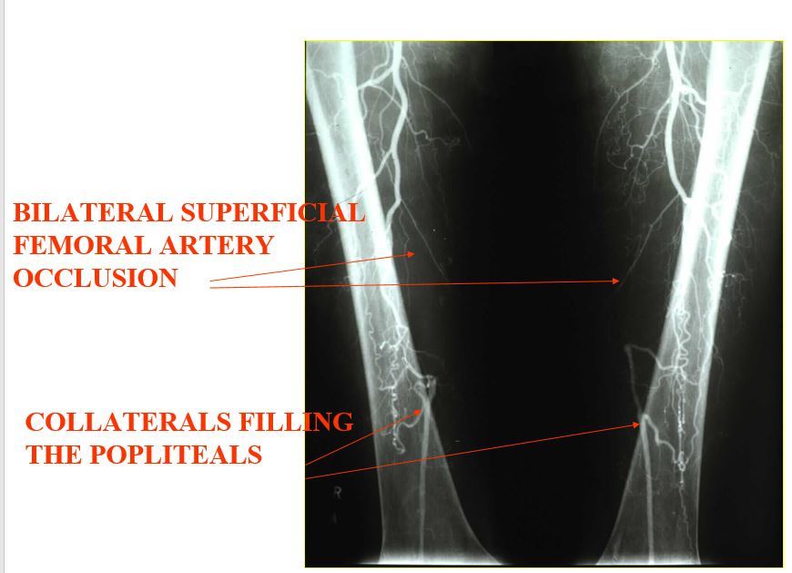 Angiogram showing: narrowing of the left SFA with complete occlusion more distally, collaterals filling the distal segment