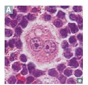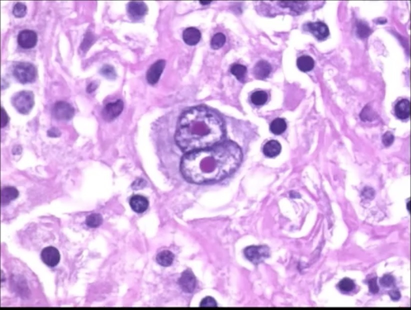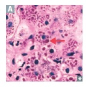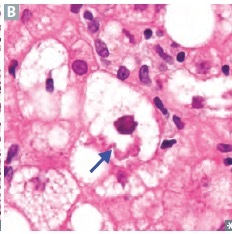 (intracytoplasmic eosinophilic inclusions of damaged keratin filaments)