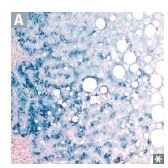 Hemosiderin (iron) identified on liver mRI or biopsy with Prussian blue stain