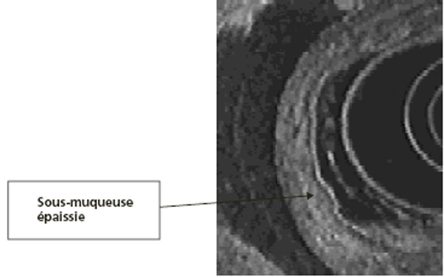 Las sous-muqueuse (3e couche) est épaissie et hyperéchogène: LINITE gastrique