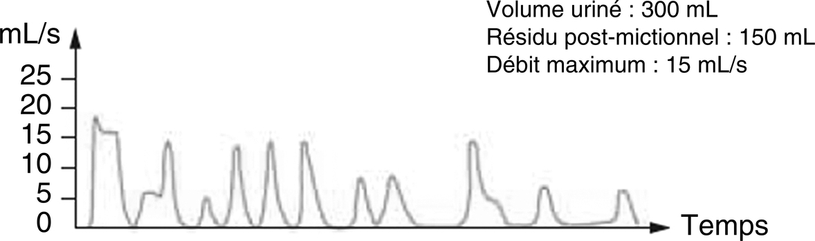 Courbe de débitmétrie pathologique avec nombreuses poussées abdominales