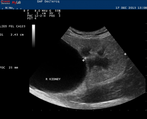 kyste du rein= d’allure simple car lésion anéchogène avec renforcement postérieur non vasculaire sans végétations et à parois fines. (! Bosniak= définition scannographique!)