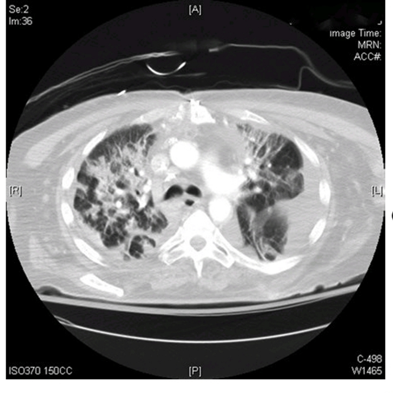 ° Chest computed tomography (CT) findings are opacification that is denser in the most dependent regions as compared to more normal and hyper-expanded lung in the nondependent ones. In addition, CT chest shows widespread ground-glass attenuation, which is a nonspecific sign that reflects an overall reduction in the air content of the affected lung.