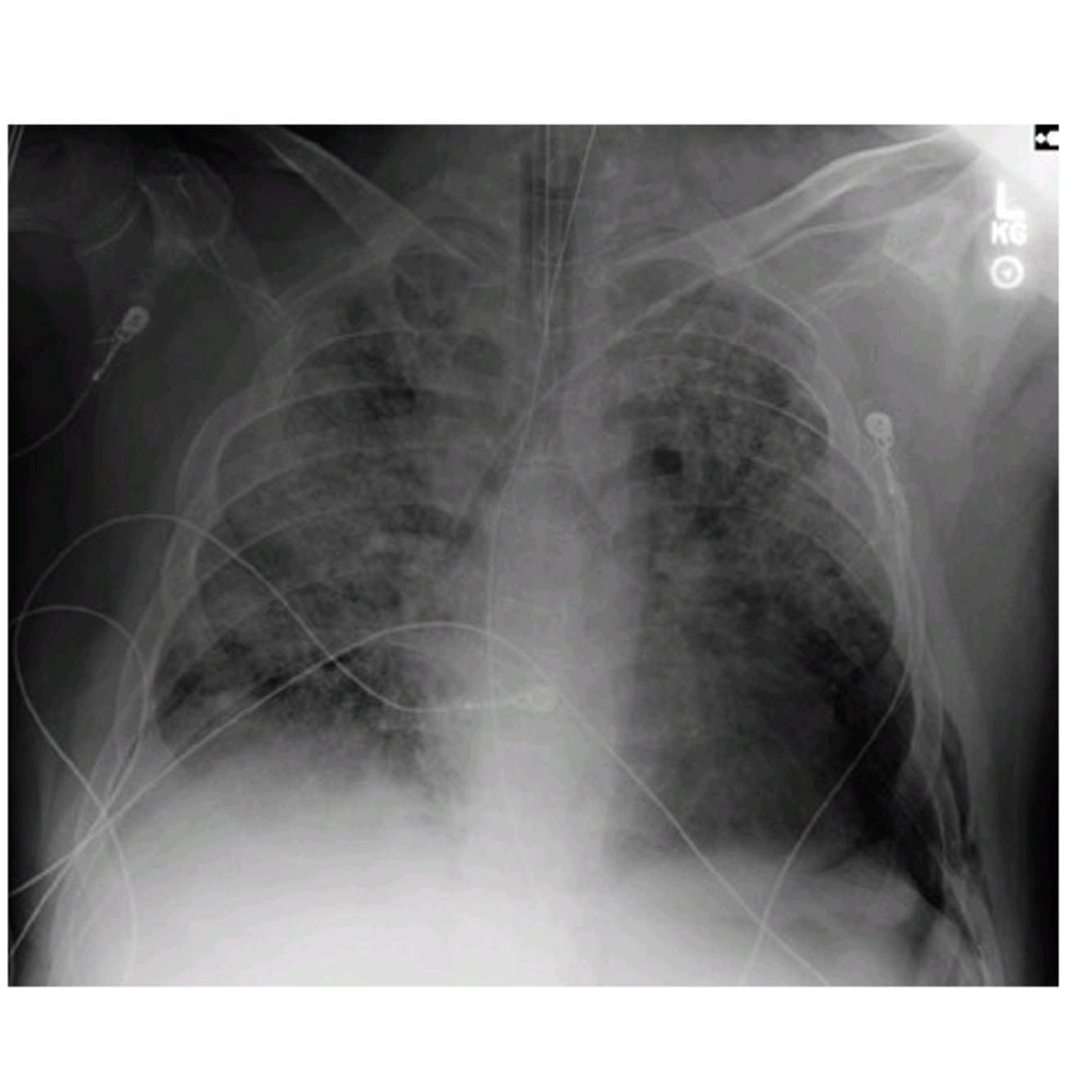 ° It presents with bilateral opacities on the chest X-ray involving at least three quadrants that are not fully explained by effusions, atelectasis, or nodules.