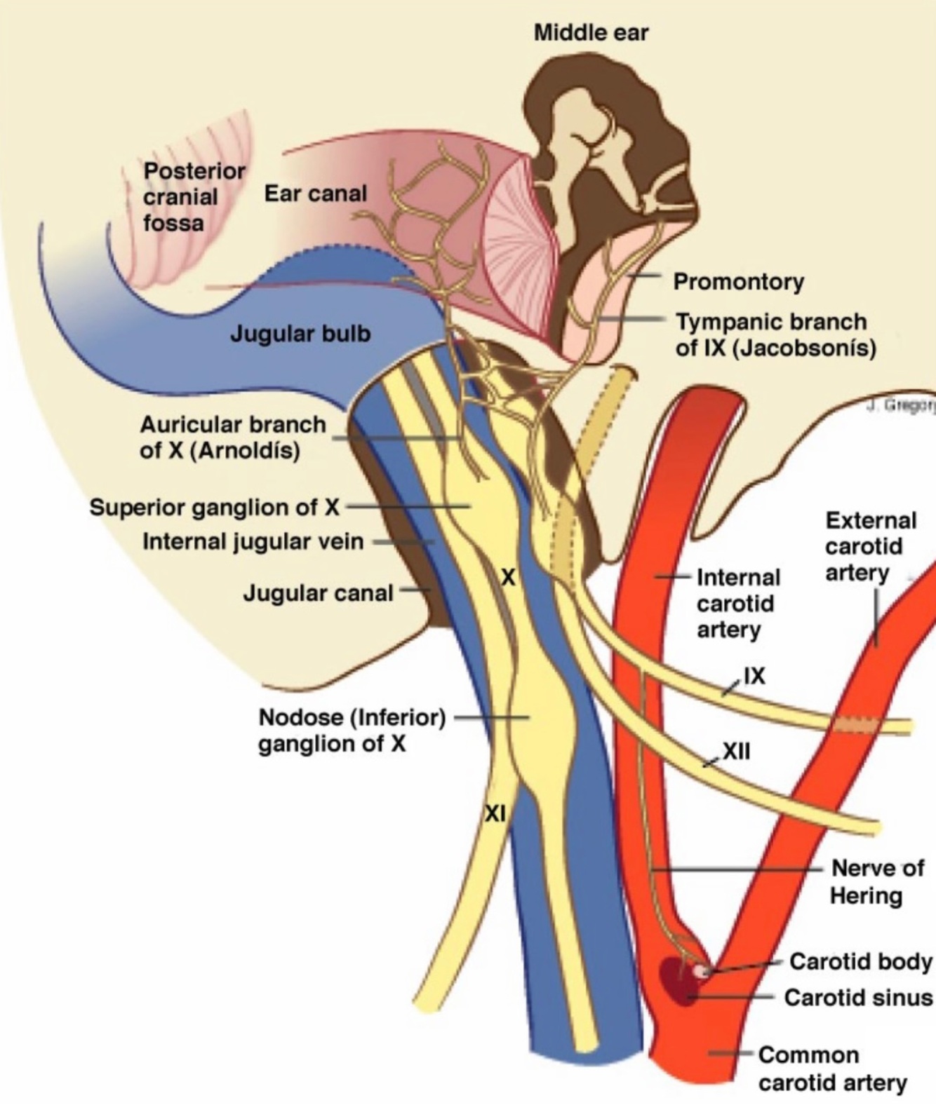 Tympanic paraganglioma tumors (glomus tympanicum) - arises from glomus body of the promontory along Jacobson’s n.