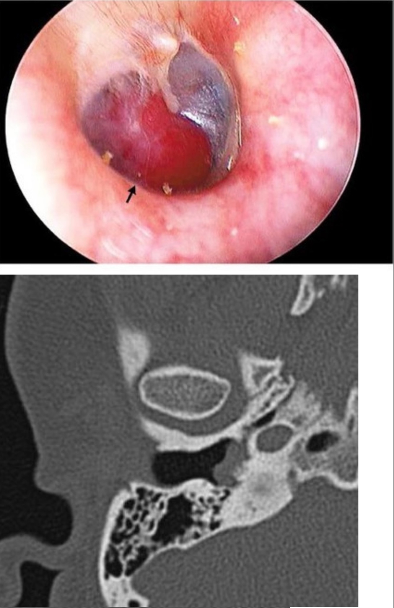 Imaging shows tissue filling the EAC, with an Intact TM.