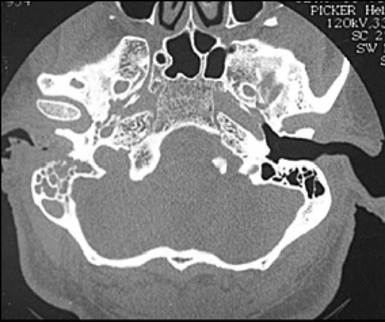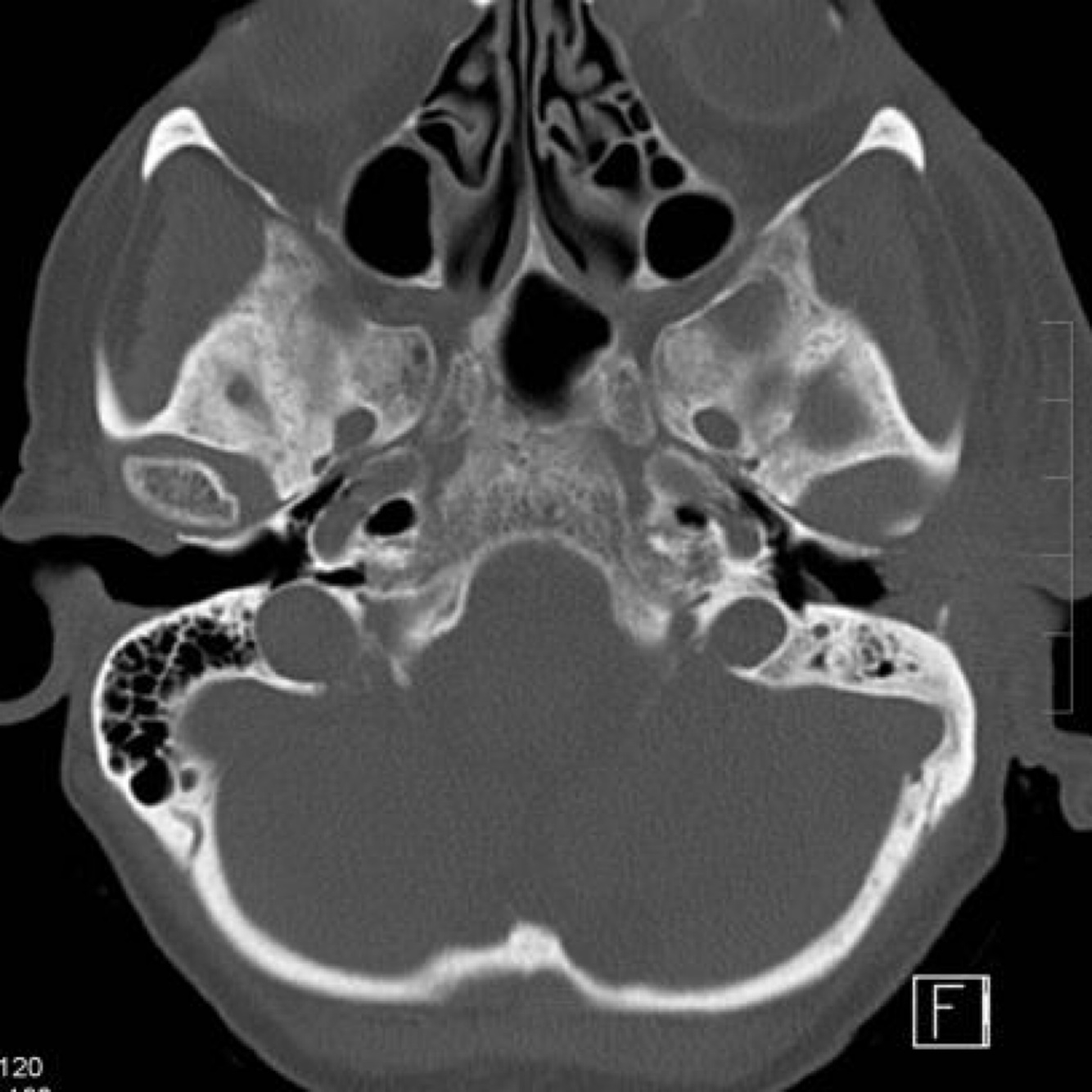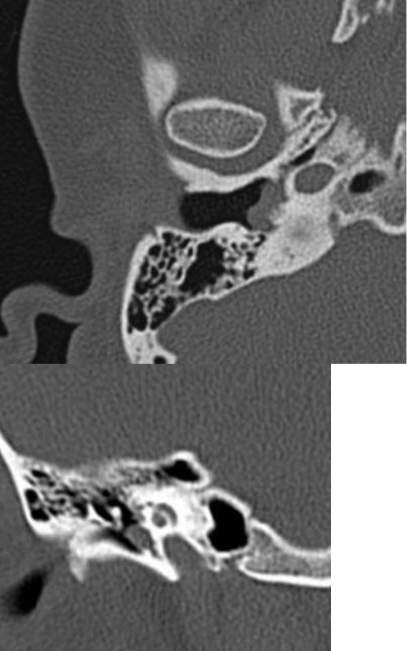 The typical finding of post-inflammatory medial canal fibrosis is that of soft tissue in the medial 1/3rd to 1/2 of the canal that is indistinguishable from the TM, w/o erosion or expansion of the bony ear canal.