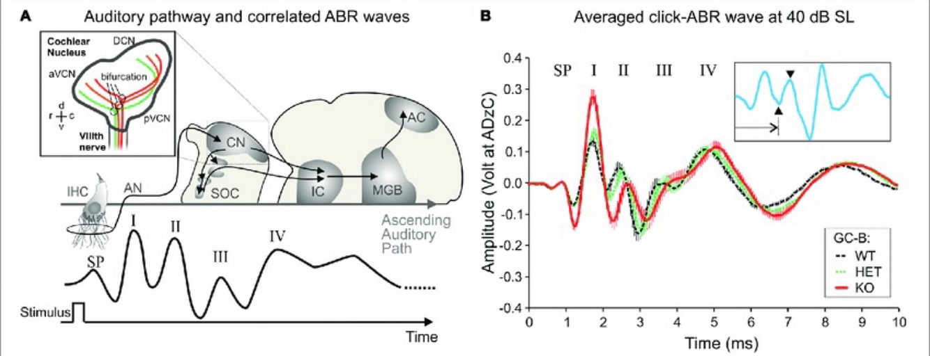 ABR testing uses electrodes placed on the vertex and mastoid to detect electrical signal changes in response to unilateral auditory ‘clicks’.