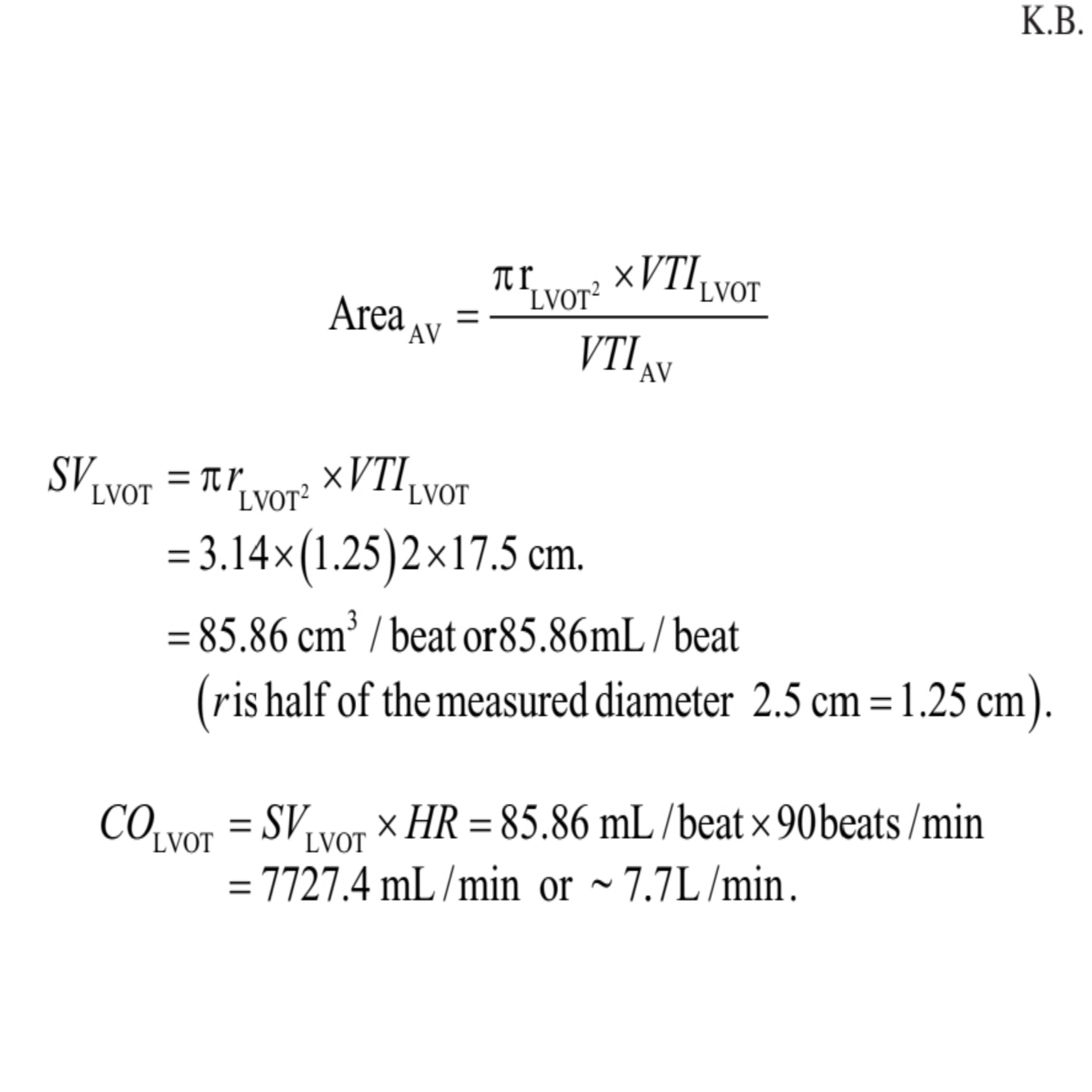 LVOT velocity (Vmax) of 69.2 cm/s, aortic valve VTI of 152 cm and an aortic valve Vmax of 533 cm/s. The heart rate on the monitor was 97 beats/min. How would you calculate the stroke volume and cardiac out?