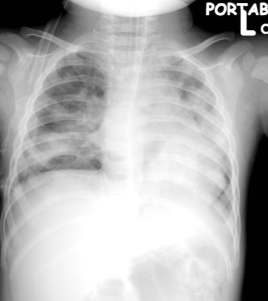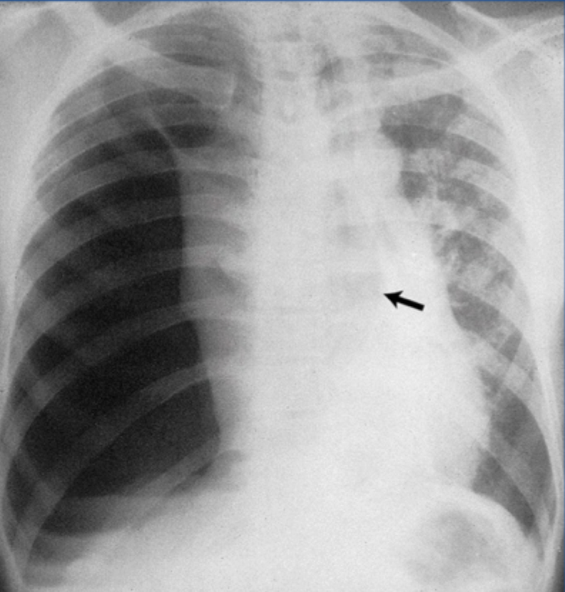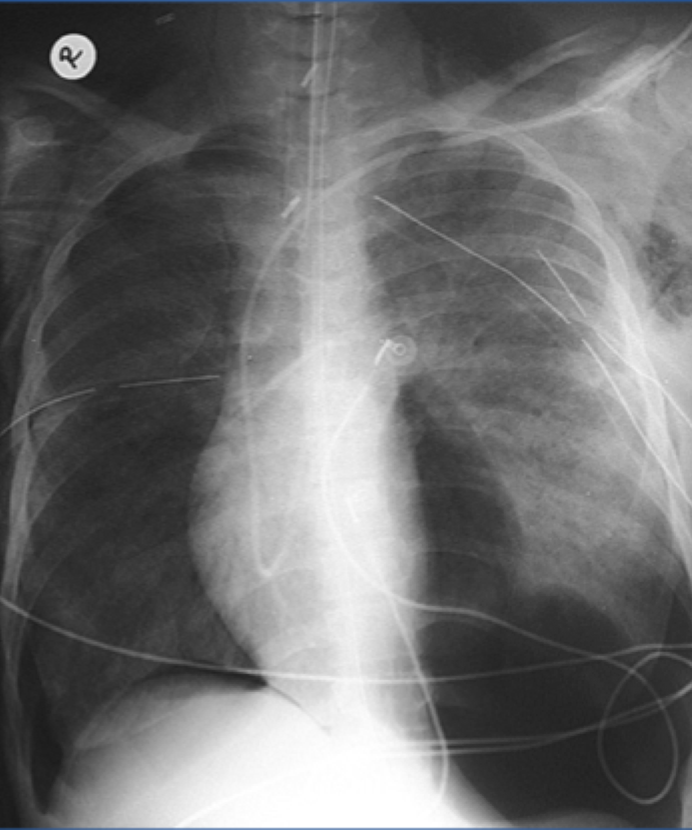 Deep sulcus sign + contralateral shift of mediastinum/esophagus -> TENSION PNEUMOTHORAX