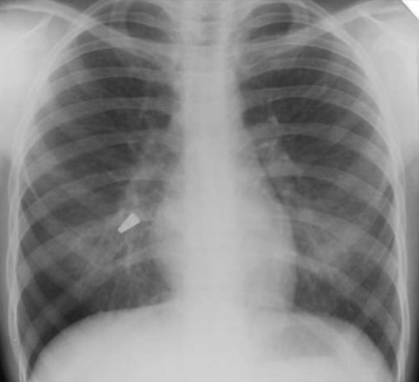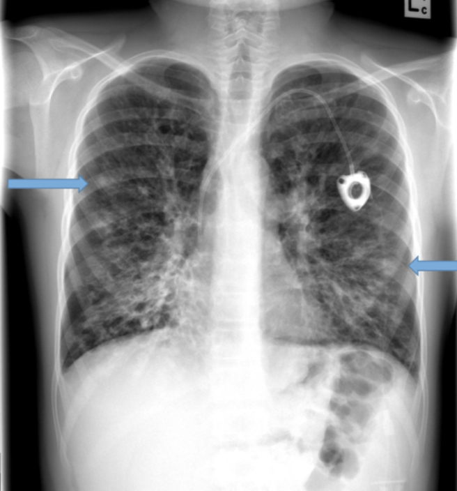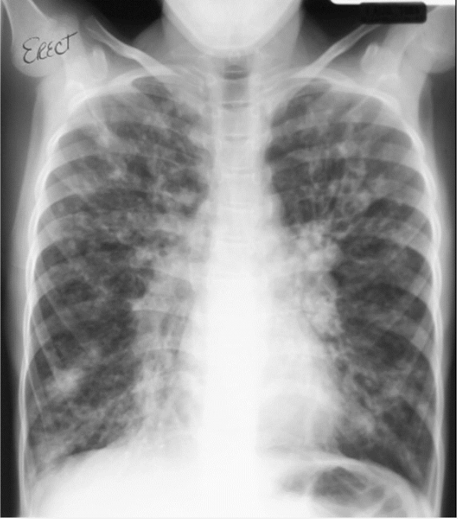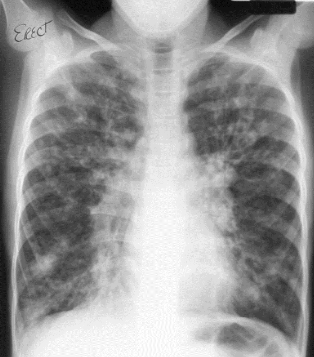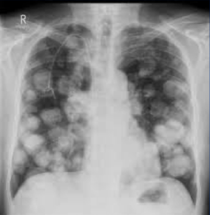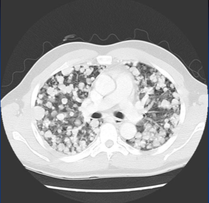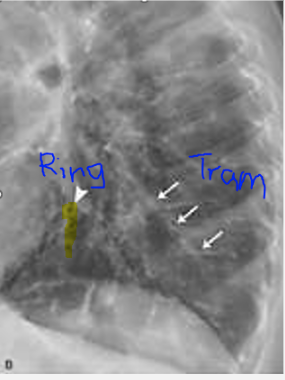 - Dilated and thickened bronchi: Appears like tram-tracks or ring shadows