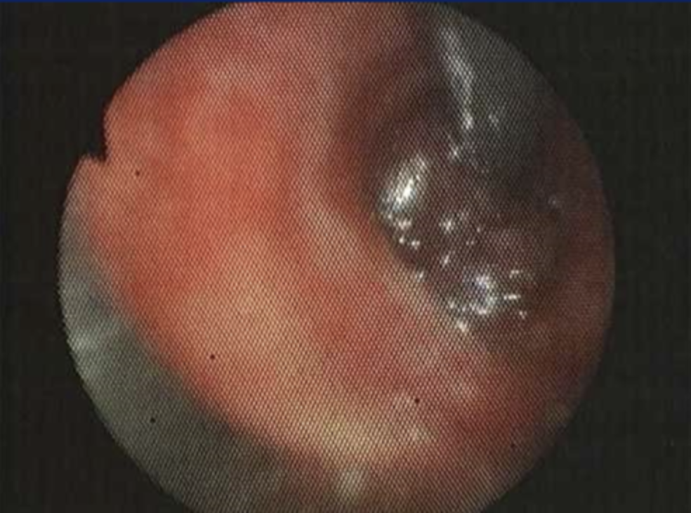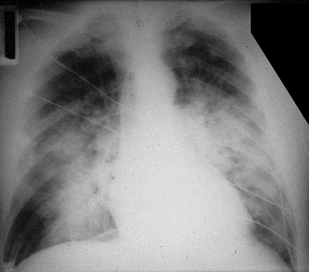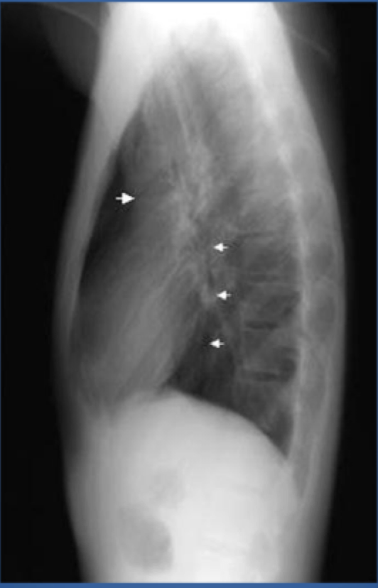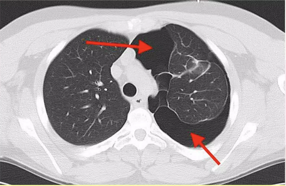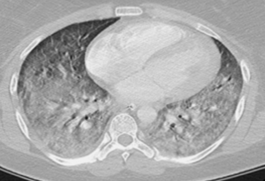 - Dilated and thickened bronchi: Appears like tram-tracks or ring shadows