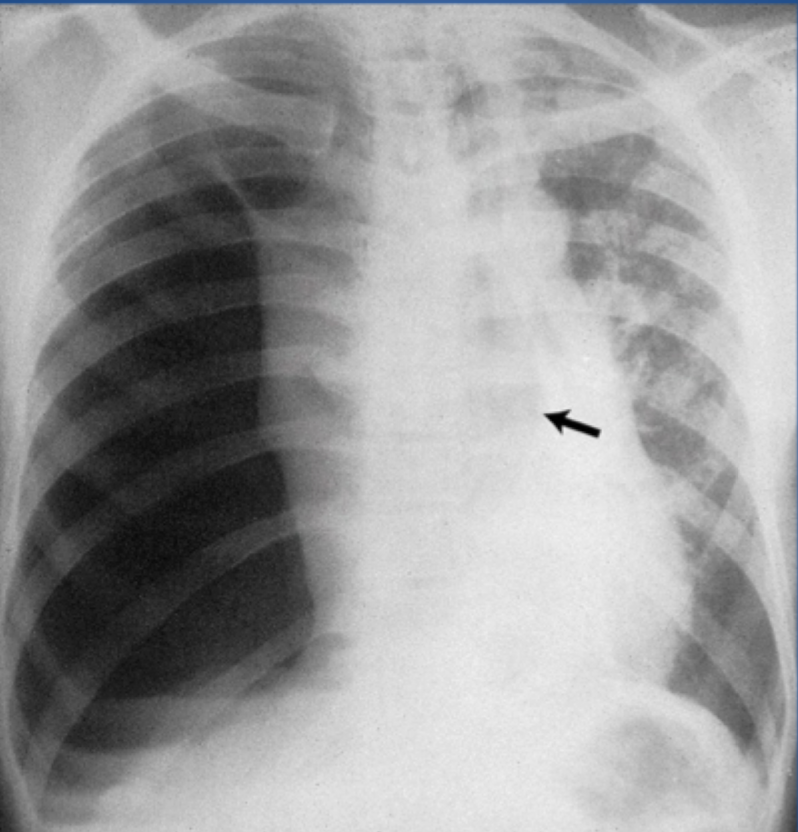 -Large amount of air in the affected hemithorax and CONTRALATERAL shift of the mediastinum