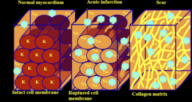 stays in extracellular content with less perfusion, so mostly in scars and in empty and dead infarct cells