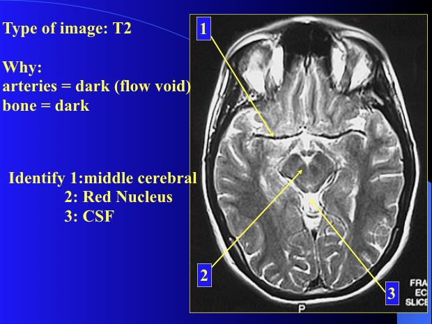 Flowing blood (not bleeding) appears dark on a T2 but not on CT/T1.