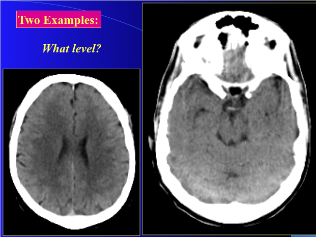 right: brainstem level (the eyeballs are present)